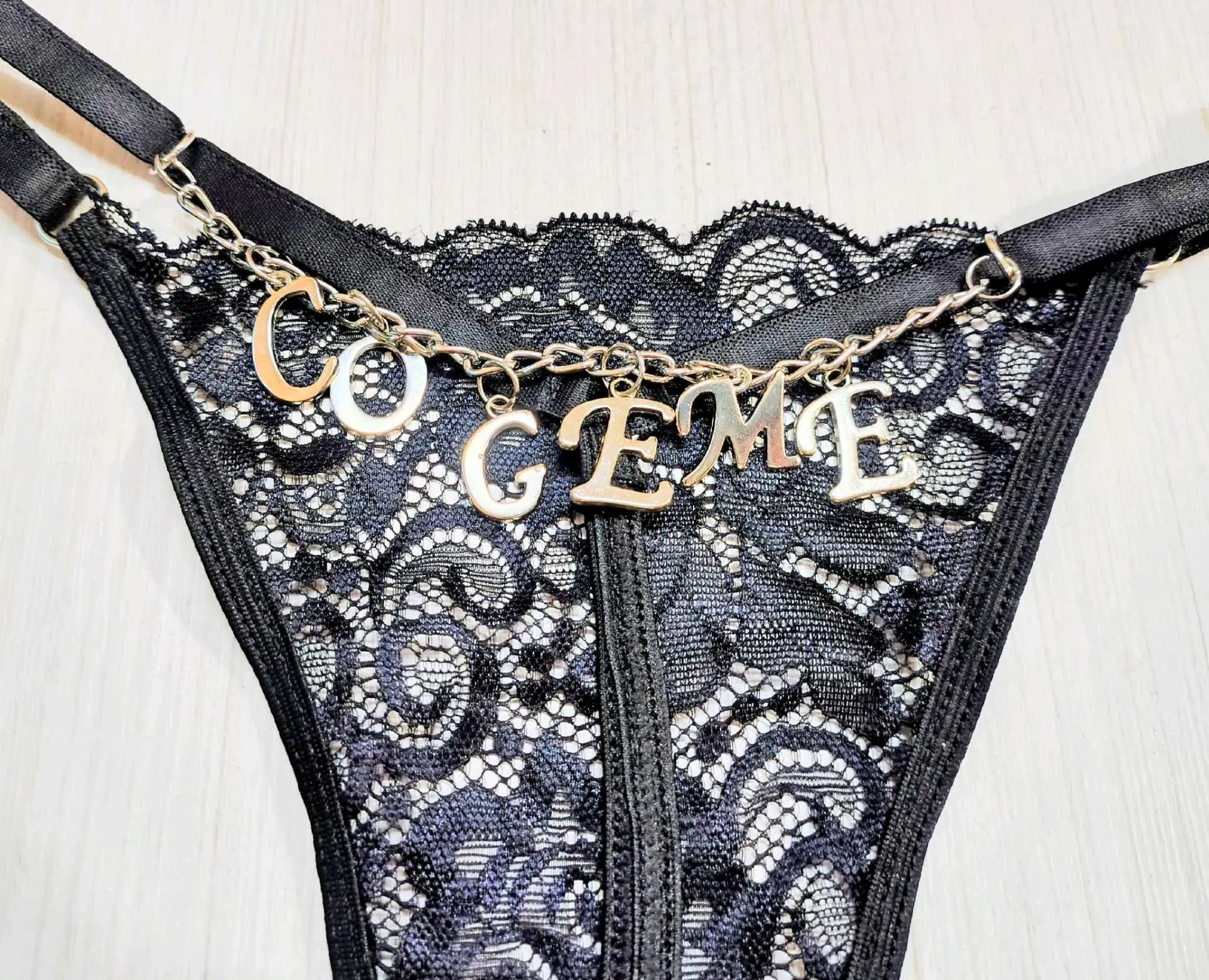 Deslumbra con este sensual Hilo Dental de Encaje 'Cógeme' con Cadena Trasera en color negro. Ajustable y provocativo, con la inscripción 'cógeme' para un toque atrevido. Perfecto para añadir un toque de seducción a tus momentos especiales. ¡Hazte notar con este elegante y sexy hilo dental!