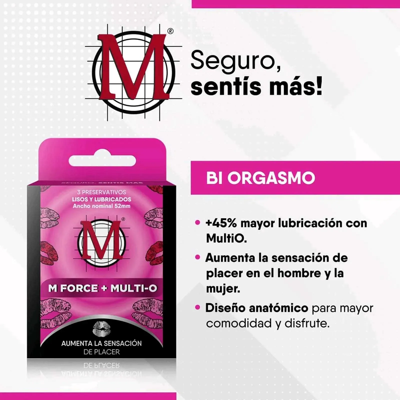 Preservativos M force lubricados con MultiO (lubricante termogenico) [BI ORGASMO]:45% mayor lubricación con MultiO. Mejora la sensación de placer en el hombre y la mujer. [SEGURIDAD] Comprobados electrónicamente, cumplen con los más rigurosos estándares de calidad.